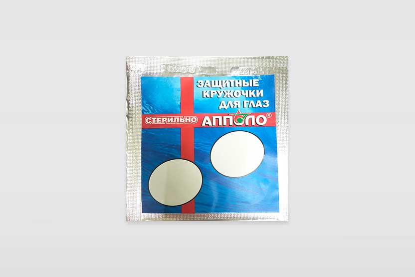 Полимерный гель, йодовидон, анилокаин, повязка из нетканого полотна в форме маски и защитные кружочки для глаз